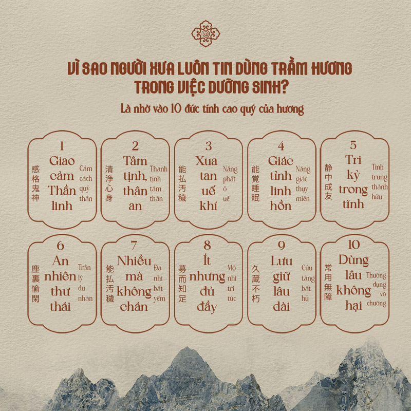 Dưới đây là mười phẩm chất mà người xưa gọi là “đức hương”, chỉ khi sống cùng trầm thật ta mới có thể dần cảm ra từng điều một, như từng lớp khí hiện dần trong tĩnh.
