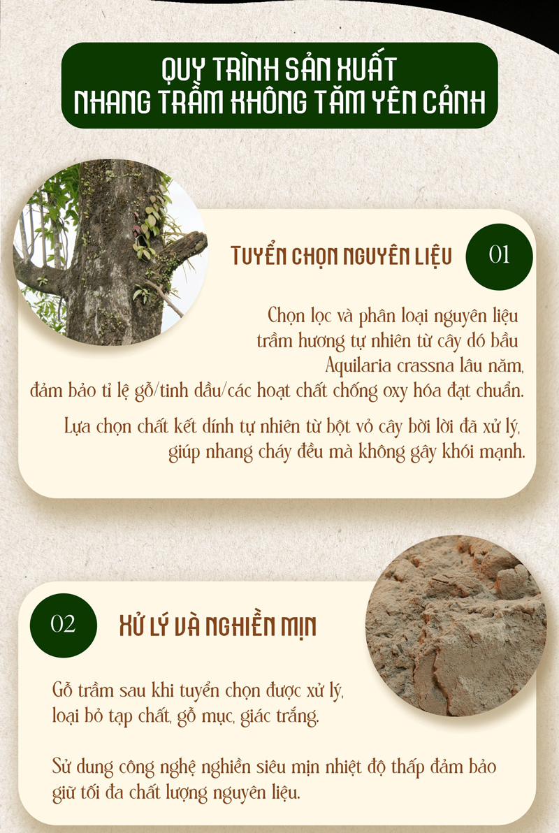 Người tiêu dùng hay nhà sản xuất cần hiểu rõ quy trình sản xuất nhang trầm hương tập trung vào độ tinh khiết, đảm bảo giữ trọn vẹn mùi hương trầm hương tự nhiên mà không có tạp chất hóa học. Mùi hương thường bị hao hụt và ảnh hưởng mạnh ở những giai đoạn sau: