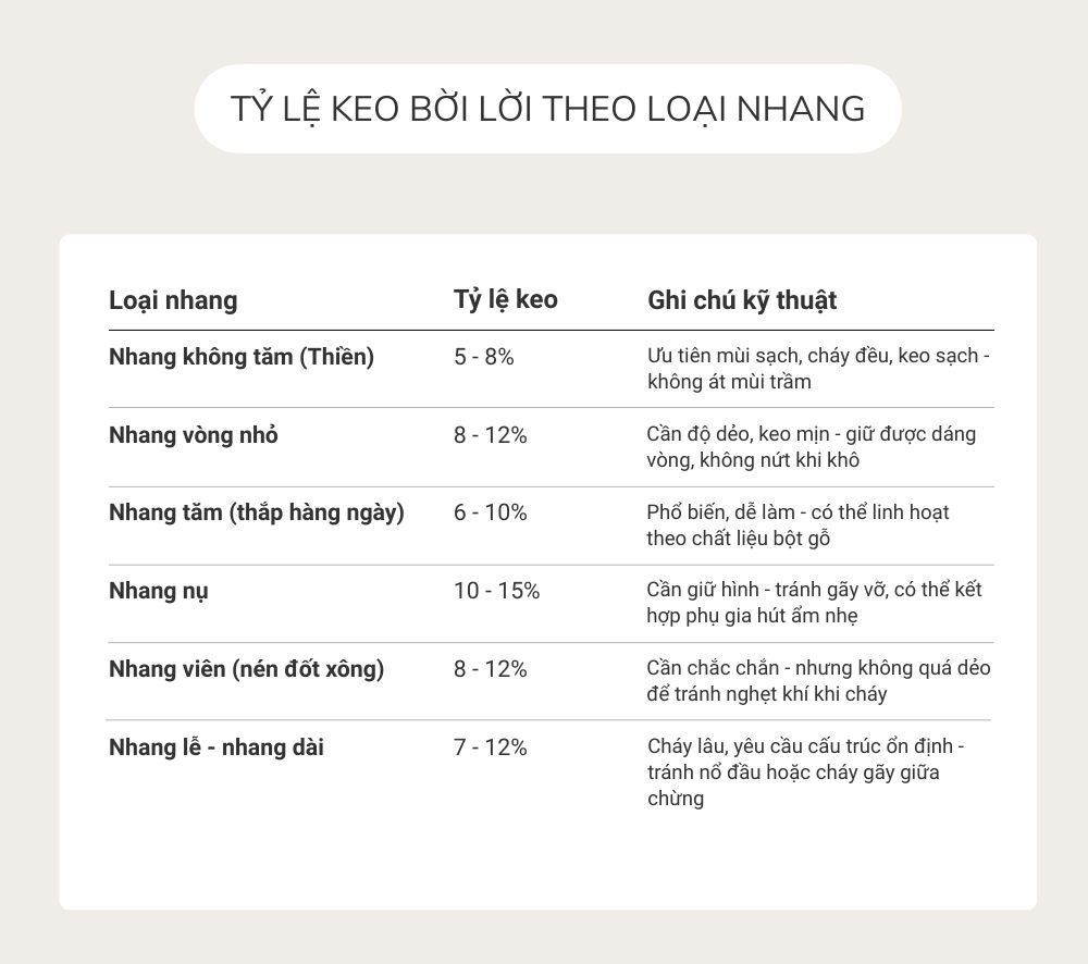 - Giảm keo vừa đủ – để nhang vẫn định hình đẹp, nhưng không làm nghẹt hương.