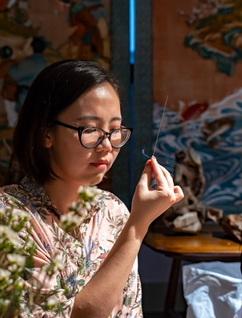 Chú thích ảnh: Ms Emma, Dreamship, thưởng nhang trầm hương không tăm tại 1 buổi workshop Hương thơm chữa lành Ân Vũ